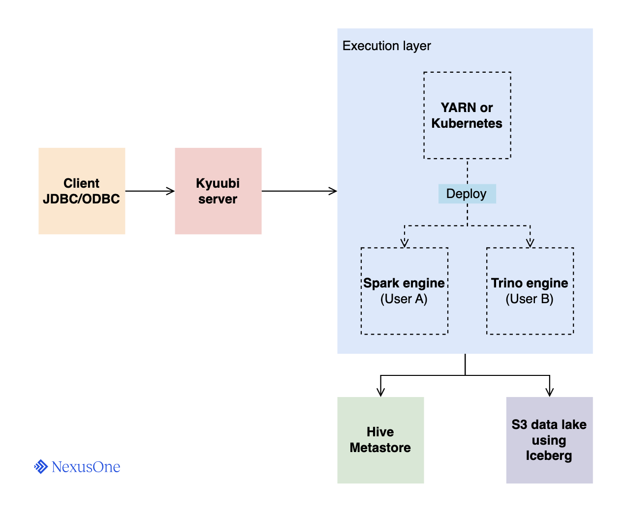 - SQL gateway: Kyuubi extends the Apache Spark Thrift JDBC/ODBC Server, which exposes a JDBC/ODBC interface over the Thrift protocol. This allows multiple clients to connect and run SQL queries without needing to know the details of the backend execution engine.